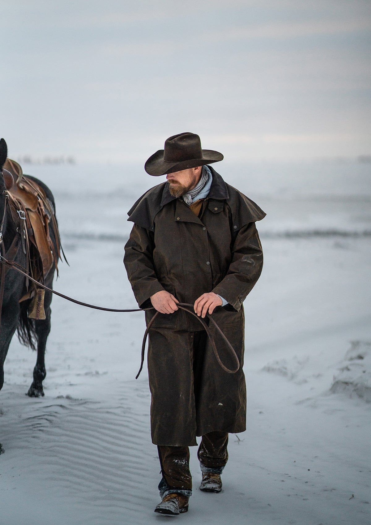 Think of the Stockman Duster as the next step up from our Low Rider Duster—3 inches longer for extra coverage while maintaining all the rugged, functional features you love. Crafted from 12oz waterproof, breathable oilskin and lined with cotton and taffeta, it delivers warmth, protection, and freedom of movement with rear saddle gussets and adjustable leg straps.