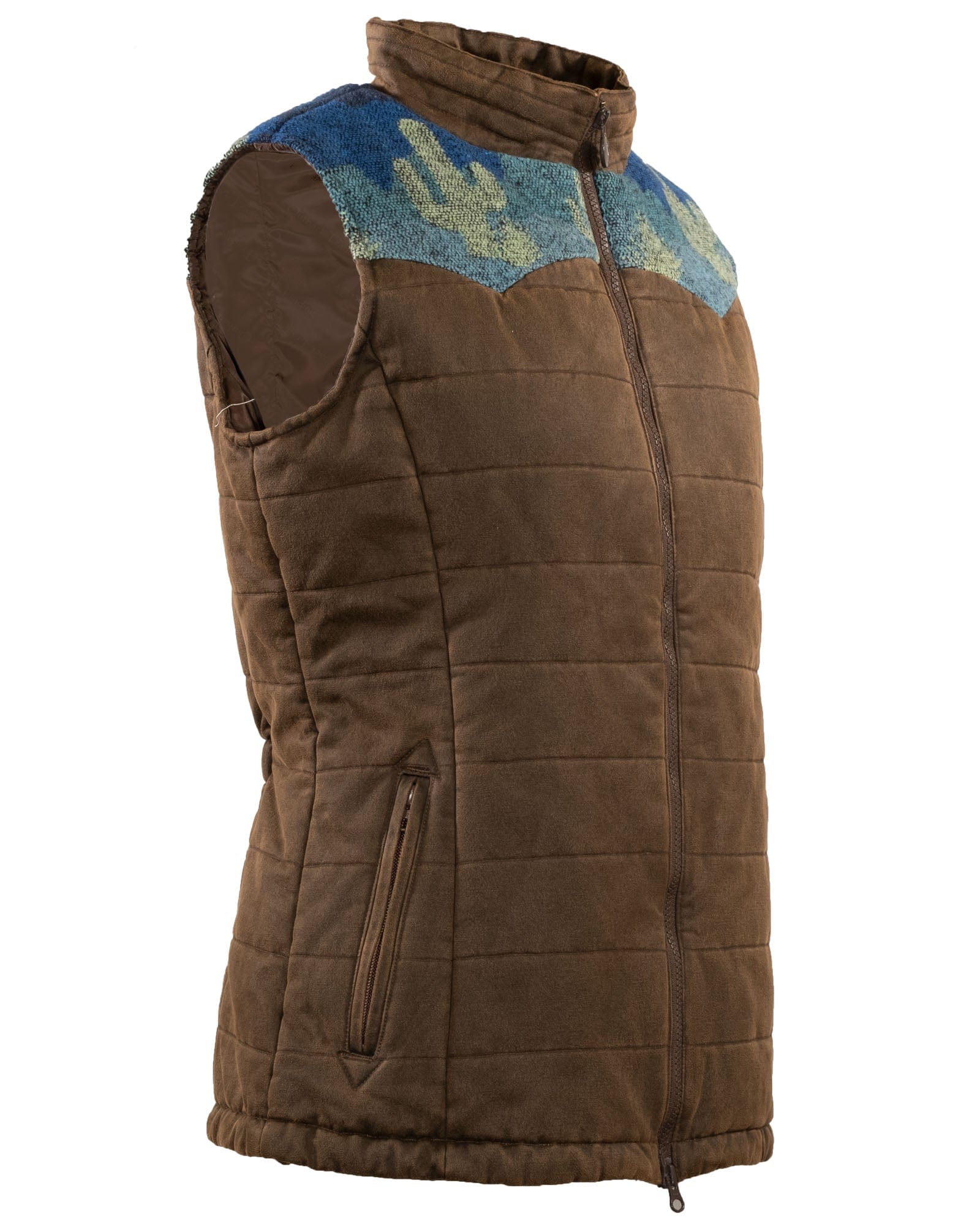 Take the Colorado Mountains with you wherever you go in this great vest! Our Ashlyn Vest is made with our water-resistant canyonland in blue and features a beautiful mountain scene around the shoulders. The Ashlyn Vest also has a gathered back to give you shape and a 2-way zipper.
